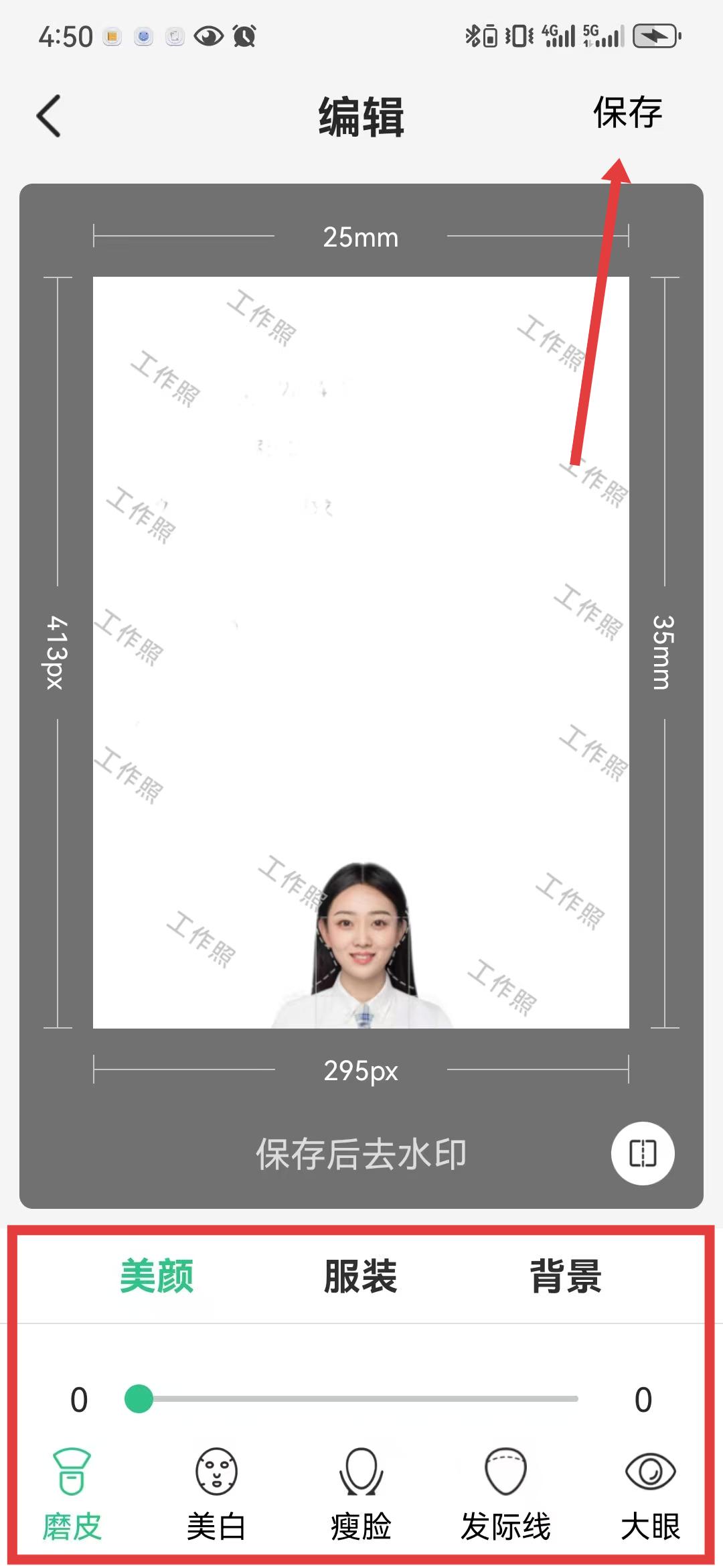 3、選擇照片后進入編輯頁面,在該頁面可對照片進行美顏處理,還可更換服裝和背景,編輯完成后點擊右上角的保存按鈕,即可將編輯好的照片保存到手機相冊中。
