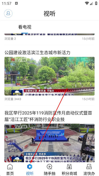 2、點擊視聽選項進入視聽頁面,瀏覽公園建設激活濱江生態城市新活力等視頻,觀看視頻內容。