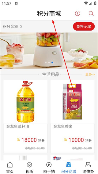4、點擊積分商城選項進入積分商城頁面,查看金龍魚菜籽油、金龍魚香米等可兌換商品,了解積分兌換規則。