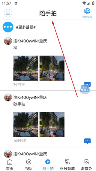 3、點擊隨手拍選項進入隨手拍頁面,瀏覽用戶分享的重慶柳等隨手拍內容,了解本地生活場景。