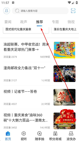 1、進入APP首頁點擊推薦分類,瀏覽渝超聯賽、潼南備戰雙十二等資訊,了解重慶本地動態。