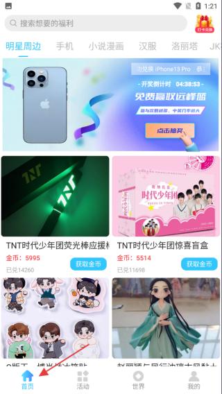 1、點擊首頁匯聚多樣福利,有手機、明星周邊等,標有金幣數與兌換情況,還可參與抽獎活動。