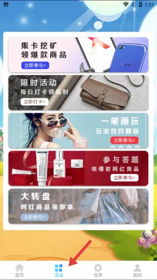 2、點擊活動頁面呈現集卡挖礦、每日打卡等豐富活動,參與即有機會贏取爆款網紅商品。