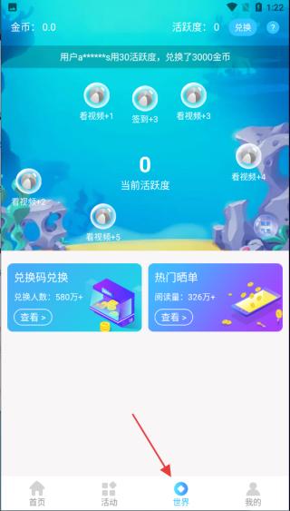 3、點擊世界頁面展示活躍度和金幣信息,能看到用戶兌換動態,還有兌換碼兌換與熱門曬單板塊。