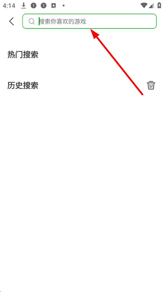 3、進入搜索界面,可搜索框輸入喜歡的游戲名稱,還能查看熱門搜索和歷史搜索記錄,方便快速找到游戲。