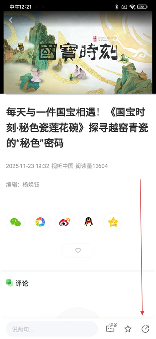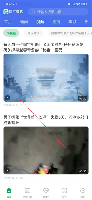 2、登錄后進入視頻板塊瀏覽小視頻分類下的內容,找到國寶時刻秘色蓮花碗相關視頻條目,點擊進入該視頻的詳情頁面。