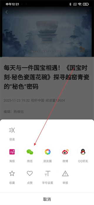 4、在詳情頁底部找到分享按鈕,點擊彈出分享選項,選擇微信等渠道,完成該視頻內容的分享。