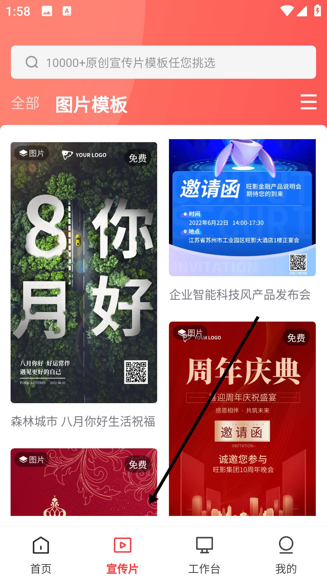 1、圖片模板界面,有森林城市八月你好生活祝福、企業智能科技風產品發布會等多種圖片模板,用戶可在首頁、宣傳片、工作臺和我的之間切換。