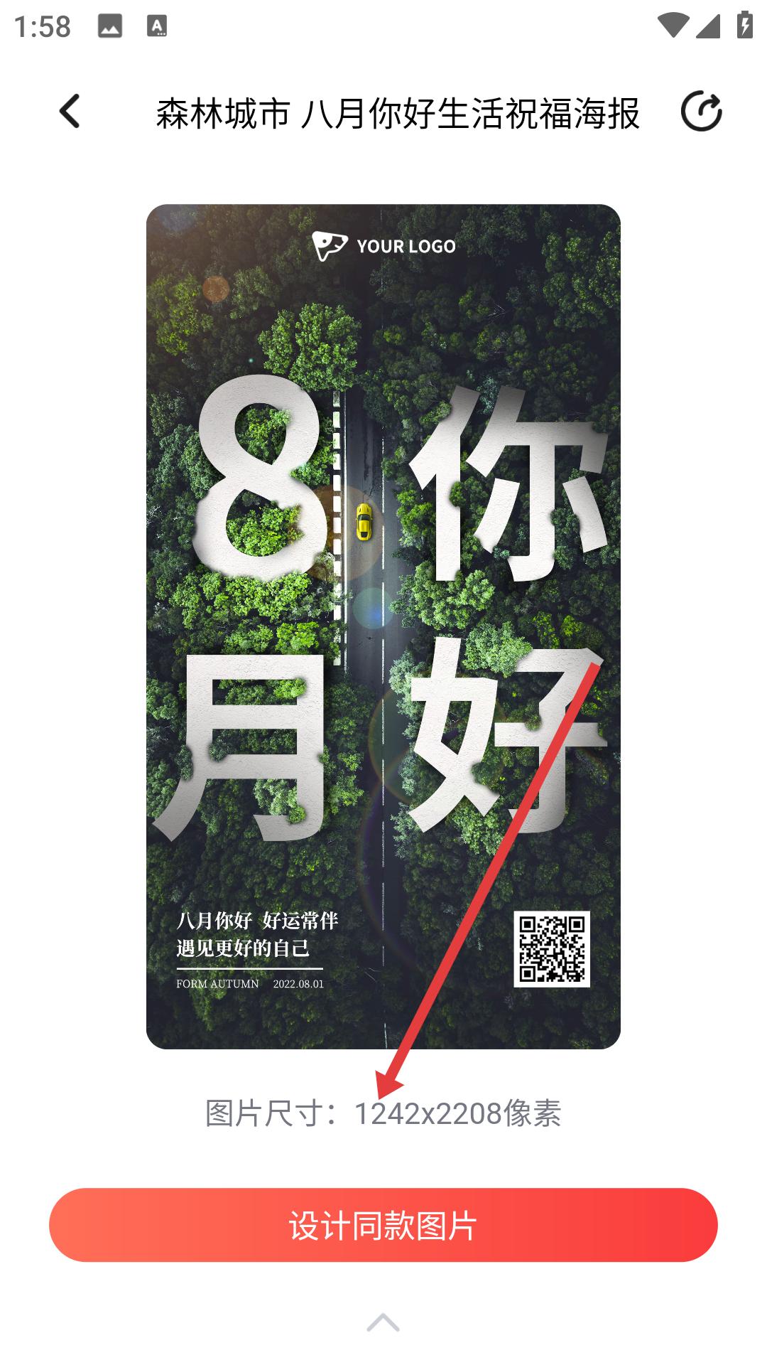 2、展示了一張森林城市八月你好生活祝福海,海報上有8月你好的字樣和相關祝福語,用戶可點擊設計同款圖片進行創作。