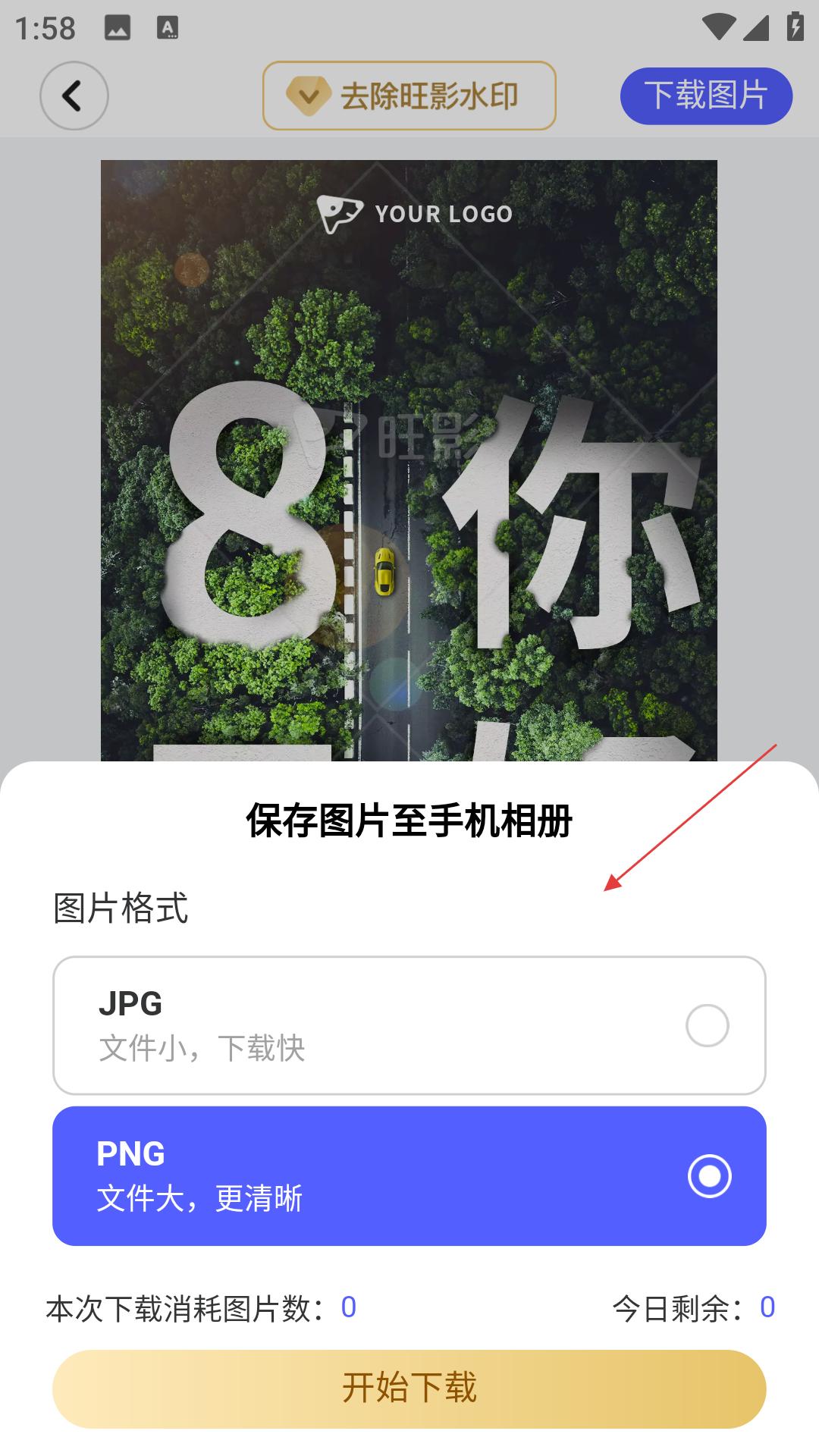 3、保存界面,用戶可選擇JPG或PNG格式保存圖片,PNG格式文件大但更清晰,點擊開始下載即可保存至手機相冊。