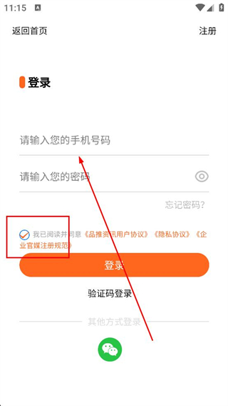 1、打開品推資訊app進入登錄頁面,輸入手機號碼和密碼,勾選已閱讀同意協議后,點擊登錄按鈕完成登錄。