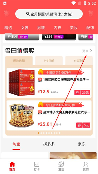 2、登錄后進入首頁可在搜索框輸入關鍵詞查找商品,也能點擊更多按鈕,查看今日熱銷商品。