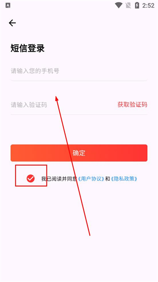 1、進入短信登錄頁面,在輸入框填寫手機號碼,點擊獲取驗證碼并填入對應內容,勾選已閱讀相關協議的選項,再點擊確定按鈕完成登錄。