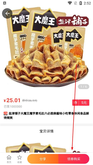 4、點擊目標商品進入詳情頁,可選擇分享按鈕傳播商品信息,也能點擊領券購買按鈕參與優惠下單。