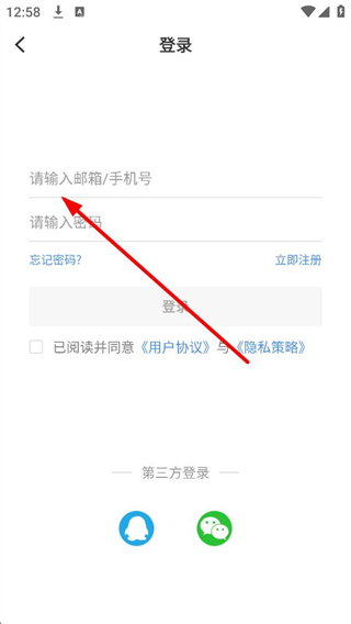 3、登錄頁面,可輸入郵箱、手機號和密碼,勾選同意用戶協議與隱私策略后點擊登錄,也可選擇忘記密碼、立即注冊或QQ、微信第三方登錄方式。