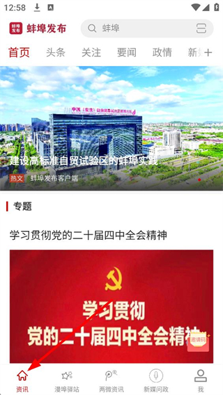 1、進入蚌埠發布資訊頁面,有首頁、頭條等新聞分類,展示本地資訊和專題內容,底部導航欄有資訊、漫埠驛站等選項,方便用戶瀏覽本地新聞和資訊。