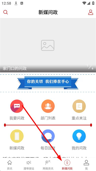 4、點擊新媒問政進入對應頁面,有我要問政、部門列表等功能入口,可進行問政相關操作,反映民生關切,獲取部門答復。