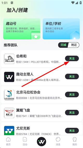 2、團隊界面,可選擇加入或創建趣動號、單位、學校團隊,還有推薦團隊如伯希和、趣動主理人等,點擊關注可關注感興趣的團隊。