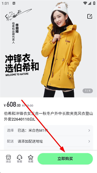 4、伯希和沖鋒衣商品詳情頁,可查看價格、款式等信息,選擇商品規格、添加配送地址后,點擊立即購買即可完成戶外裝備的購買流程。