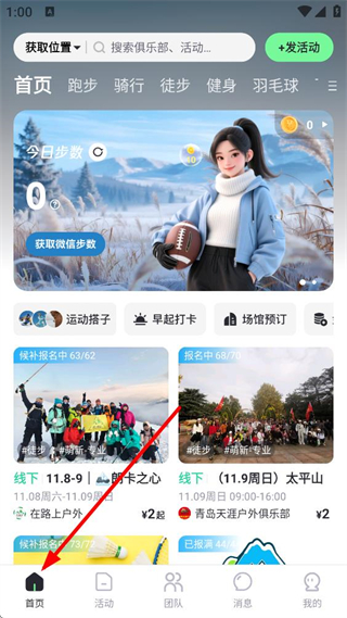 1、進入趣動WillGo首頁,可獲取位置、搜索俱樂部或活動,還能發活動,首頁展示今日步數、運動搭子、早起打卡等板塊,還有徒步等線下活動推薦。