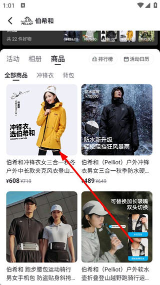 3、進入伯希和團隊的商品板塊,可查看沖鋒衣、背包等商品,如伯希和沖鋒衣女三合一秋冬戶外中長款夾克風衣登山外套等,方便挑選戶外裝備。