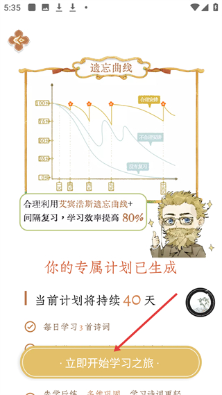 1、學習類界面,展示艾賓浩斯遺忘曲線,提示合理用曲線加間隔復習,學習效率提80,生成40天專屬計劃,每日學3首詩詞可立即開啟學習。