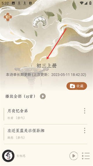 2、詩詞學習頁面呈現初三上冊詩單,長期更新,含15首詩詞,如杜甫月夜憶舍弟、韓愈左遷至藍關示侄孫湘可播放全部或收藏。