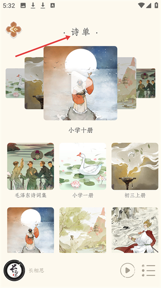 3、詩單選擇界面有小學十冊毛澤東詩詞集小學一冊初三上冊等不同學段、主題詩單,方便用戶根據需求選擇學習。