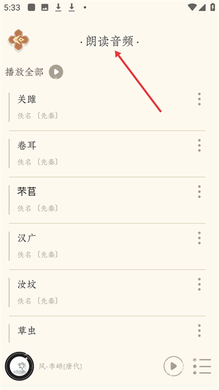 4、郎讀音頻頁面列出關雎、卷耳、芣苢等先秦佚名詩詞的朗讀音頻,可選擇播放全部或單首,助力詩詞朗讀學習。