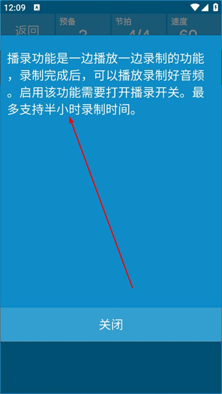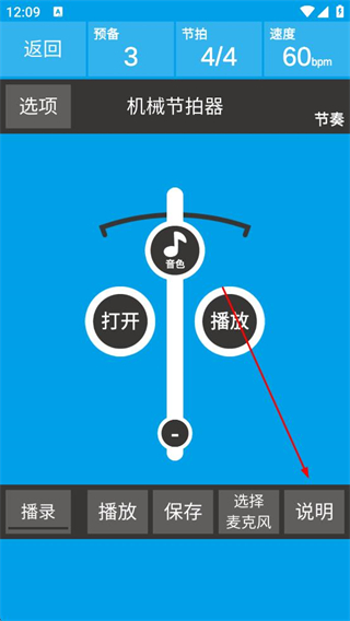 2、在機械節拍器頁面點擊說明按鈕,查看播錄功能的介紹,了解該功能的使用方式和限制。