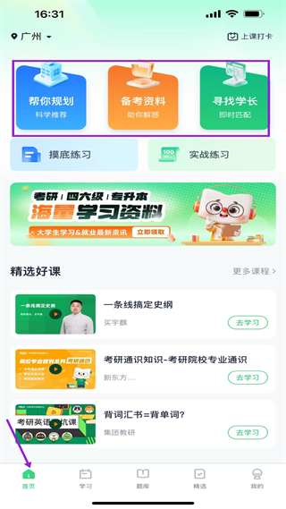 2、首頁設幫你規劃等功能模塊,提供備考資料及精選課程,覆蓋考研等多元學習需求,助力用戶高效獲取資源與規劃路徑。