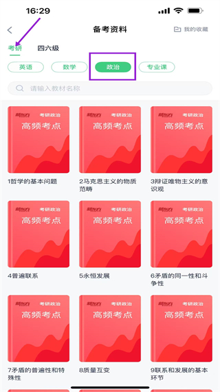 3、備考資料界面分考研等類別,聚焦政治學科展示高頻考點資料,分類清晰直觀,便于精準獲取對應科目的備考內容。