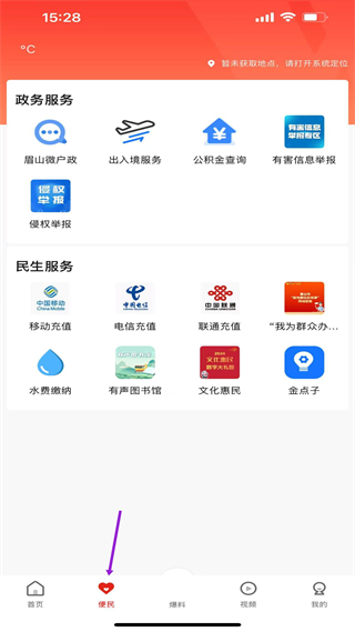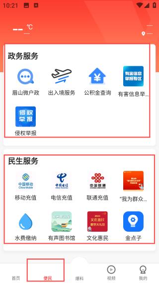 2、切換到便民板塊,可使用政務服務類功能如眉微戶政、公積金查詢,也能通過民生服務板塊完成充值、繳費等操作,獲取各類生活相關的便捷服務。