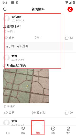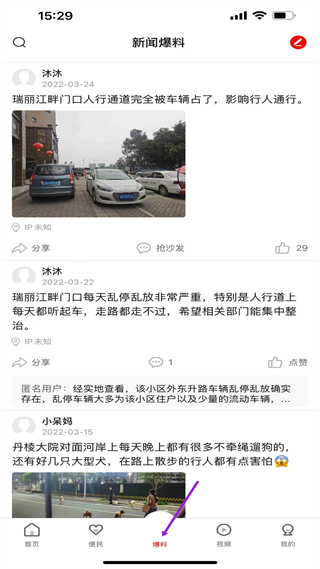 3、進入報料板塊,可查看他人發布的民生問題報料內容,比如車輛占道、不牽繩遛狗等情況,還能對這些報料內容進行互動,參與本地民生問題的關注。