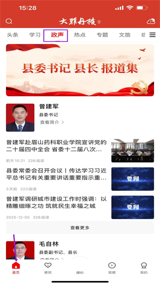 1、進入首頁板塊,可查看政聲類內容,其中包含縣委書記縣長的報道集,能了解他們參與的宣講、會議、調研等活動資訊,及時獲取本地政務相關的動態信息。