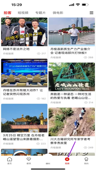 4、切換到視頻板塊,可瀏覽拍客、短視頻等分類下的內容,觀看丹棱相關的產業推介、本地活動等視頻,獲取可視化的本地資訊與生活相關內容。