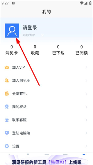 2、我的頁面能看到洞見卡收藏等功能入口,還有加入VIP加入洞見圈等選項,點擊請登錄可進入登錄界面,完成登錄后可使用更多個人相關功能。