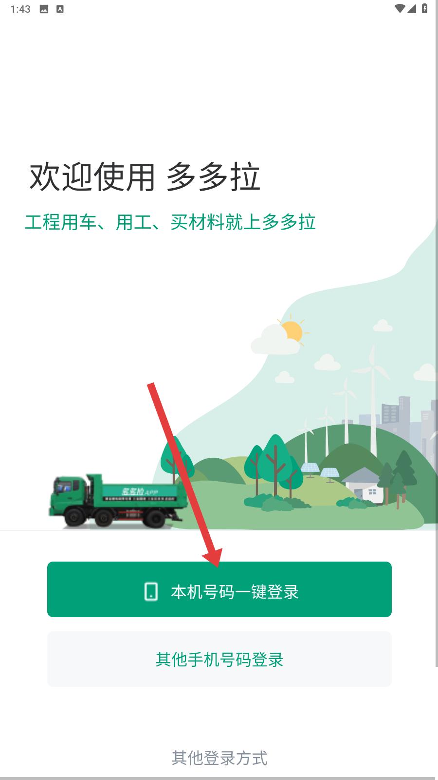 1、打開多多拉APP,在歡迎頁選本機號碼一鍵登錄或其他手機號碼登錄,若選其他號碼,進入驗證碼登錄頁,填手機號,獲取并輸驗證碼,點完成。