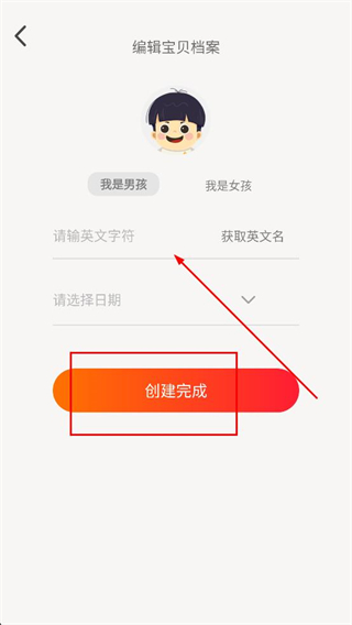 2、在編輯寶貝檔案頁面,選擇性別,輸入英文字符,選擇日期,點擊創建完成,完善寶寶信息。