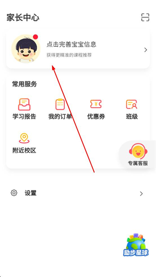 1、打開勵步云APP,進入家長中心頁面,點擊完善寶寶信息,進入編輯寶貝檔案頁面。