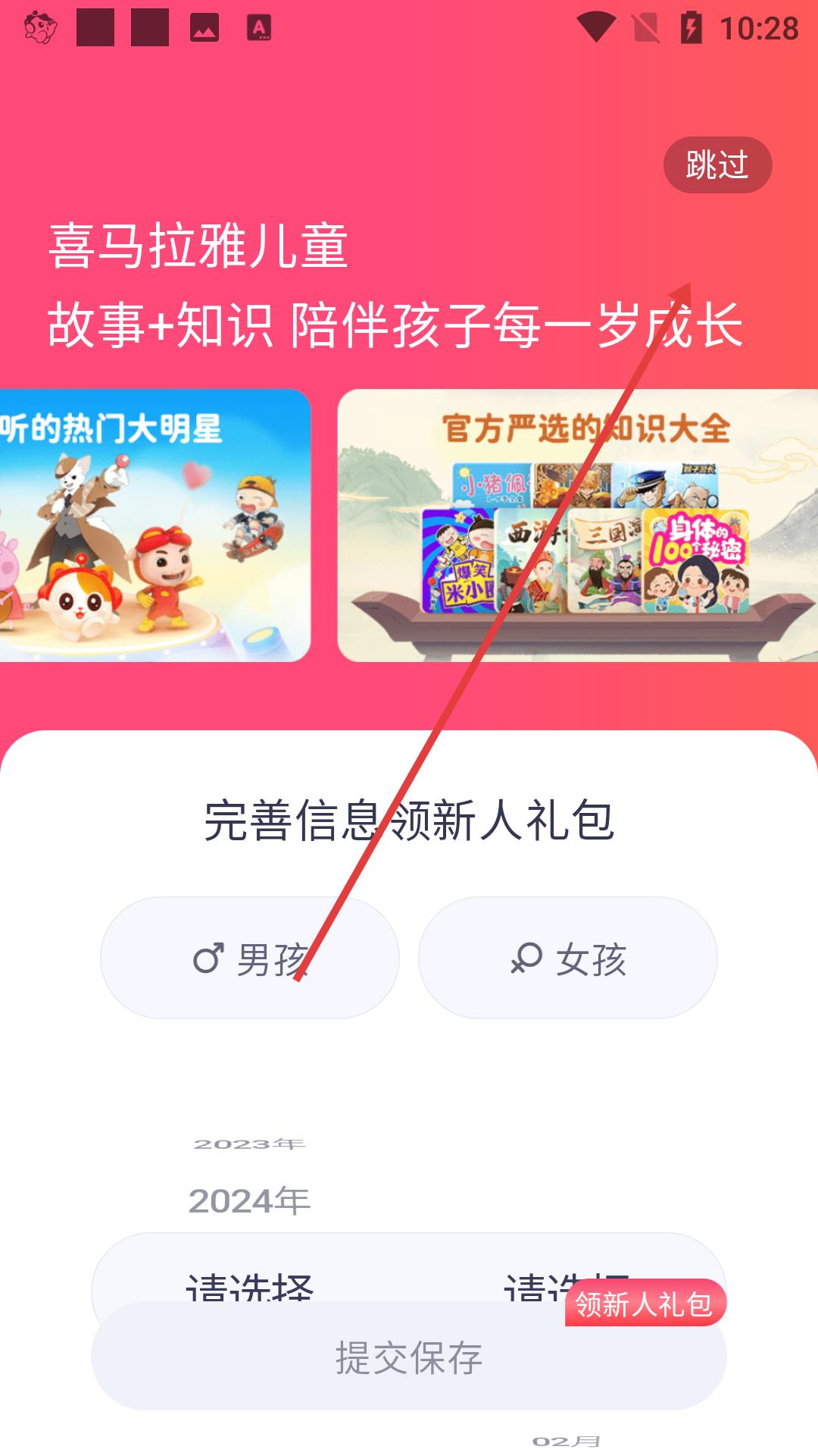 1、喜馬拉雅兒童APP可完善信息領新人禮包,選擇孩子性別和出生年份,提交保存后即可領取,助力孩子成長。