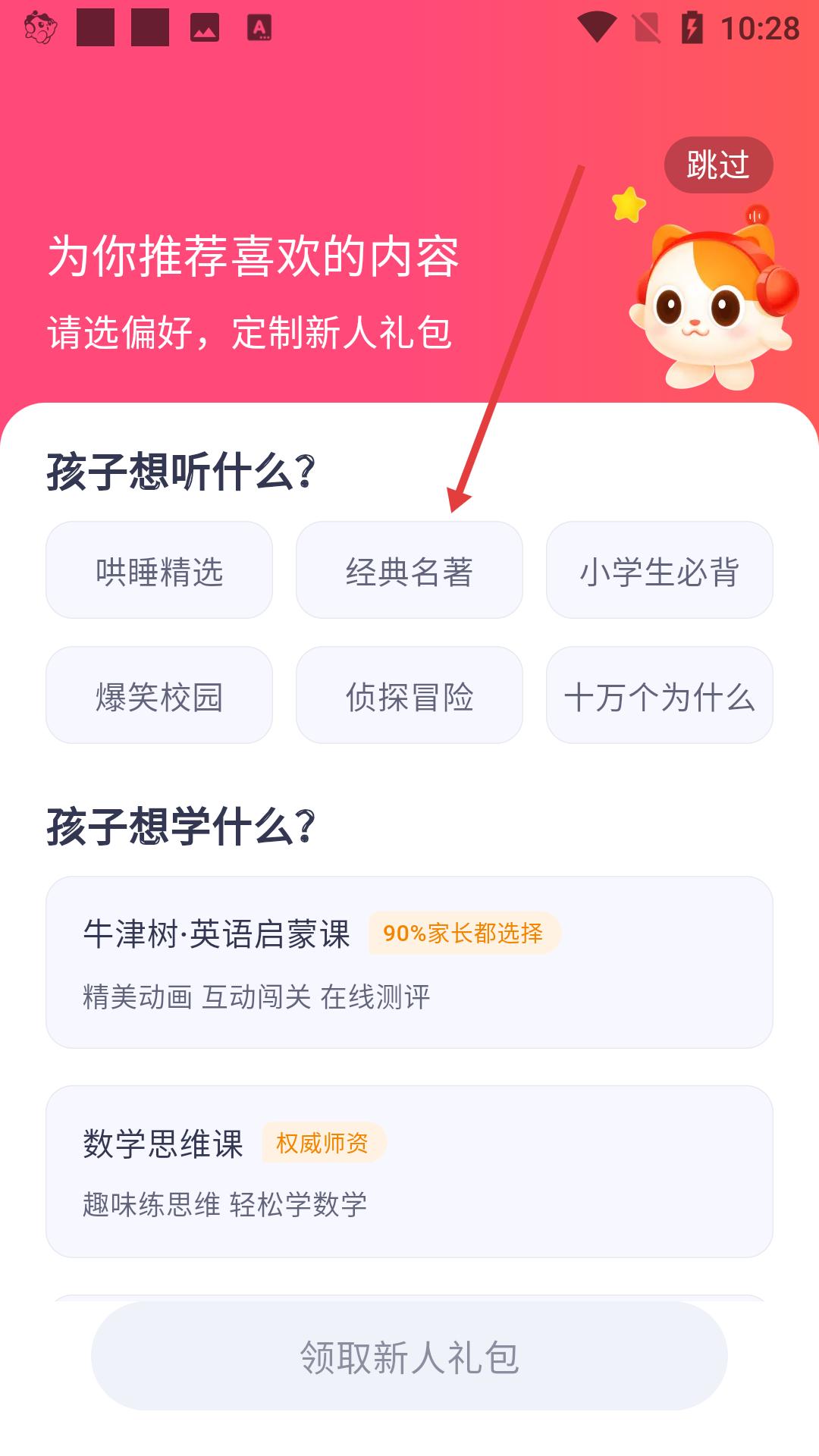 2、喜馬拉雅兒童APP能為孩子推薦內容,可選擇哄睡精選、經典名著等收聽偏好,還有英語、數學等課程可供學習。