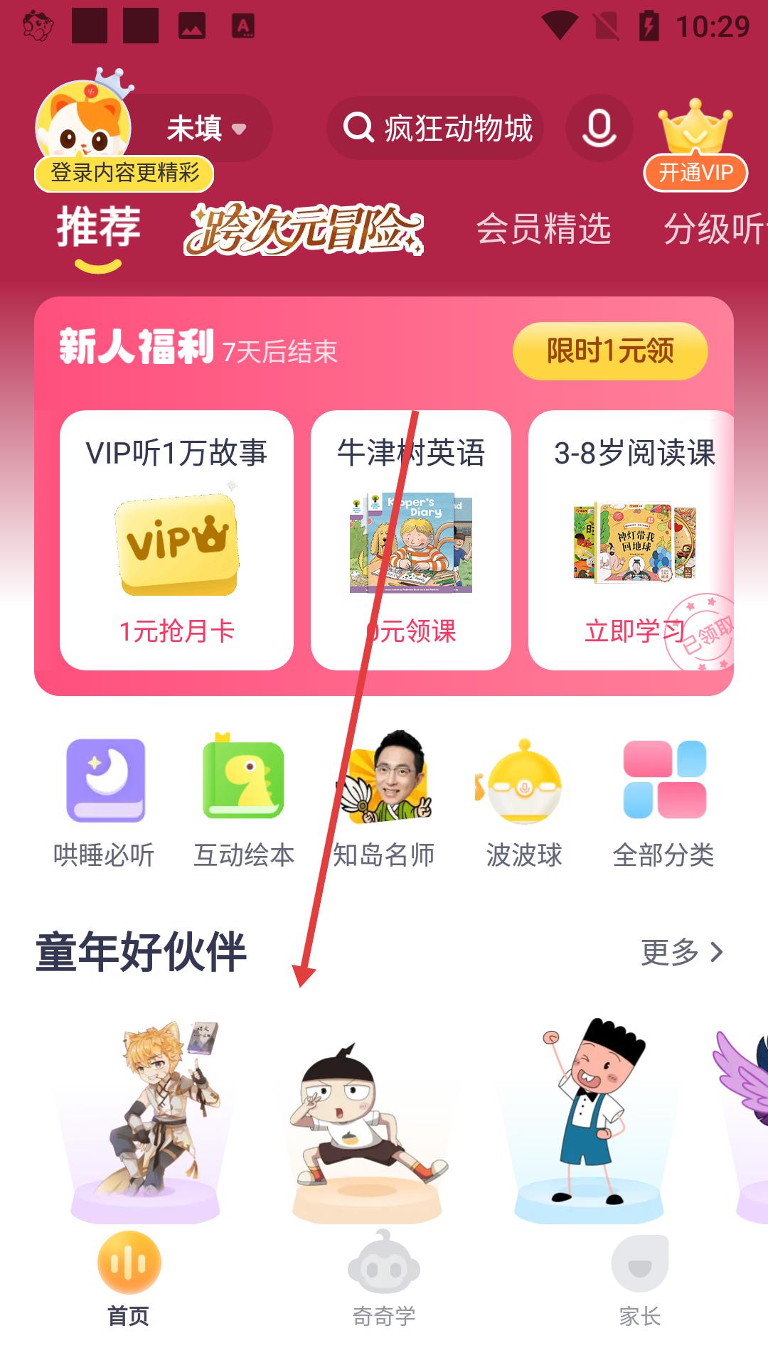 3、喜馬拉雅兒童APP首頁有新人福利,1元搶月卡聽萬篇故事,還有英語、閱讀課等,還有哄睡、互動繪本等功能板塊。