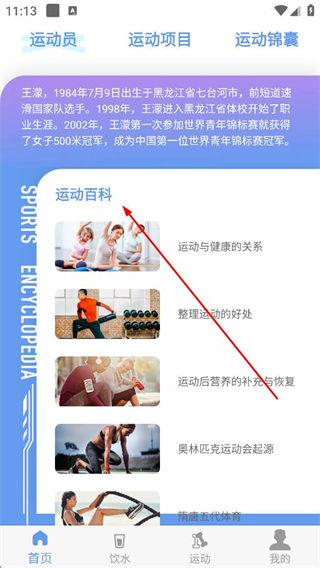 1、進入軟件后可在運動板塊查看運動百科,了解運動與健康的關系、整理運動的好處等內容,還能查看運動員王濛的職業經歷介紹。