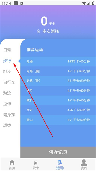 4、在運動板塊的推薦運動中可選擇步行、跑步、自行車等運動類型,查看走路、散步、競走等具體運動的卡路里消耗情況記錄運動消耗。