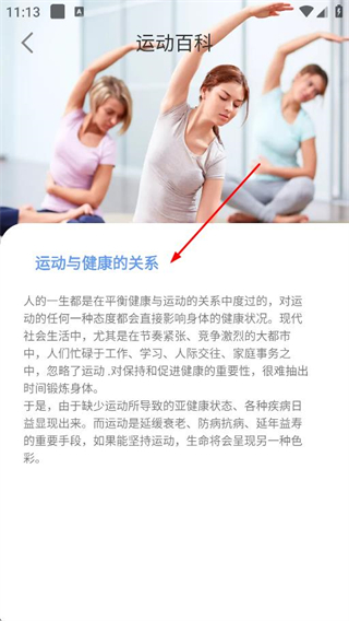 2、點擊運動與健康的關系板塊,可閱讀其詳細內容,了解運動對健康的重要性,以及缺乏運動導致的亞健康等問題,助力認識運動價值。