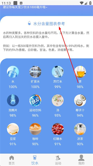 3、進入飲水板塊可查看水分含量圖表參考,了解水、礦泉水、蘇打水等各種飲品的水分含量,以便合理規劃每日飲水量。