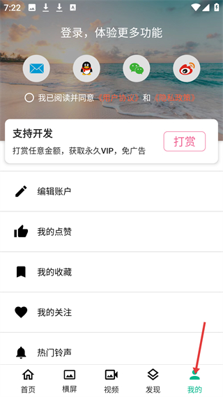 1、我的頁面,有郵箱、QQ、微信、微博登錄方式,需同意協議政策,可打賞獲永久VIP,還能編輯賬戶、查看點贊收藏關注及熱門鈴聲。
