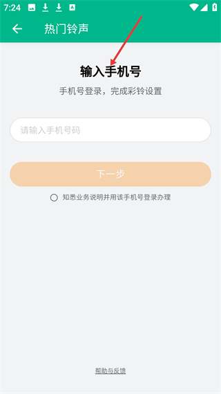 2、登錄頁,在熱門鈴聲板塊需輸入手機號登錄以完成彩鈴設置,有手機號輸入框、下一步按鈕及業務說明確認選項。