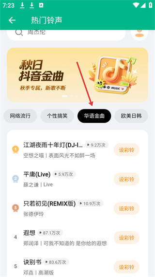 3、熱門鈴聲頁,有搜索功能,可按網絡流行等分類查找,展示鈴聲播放次數及設彩鈴按鈕。